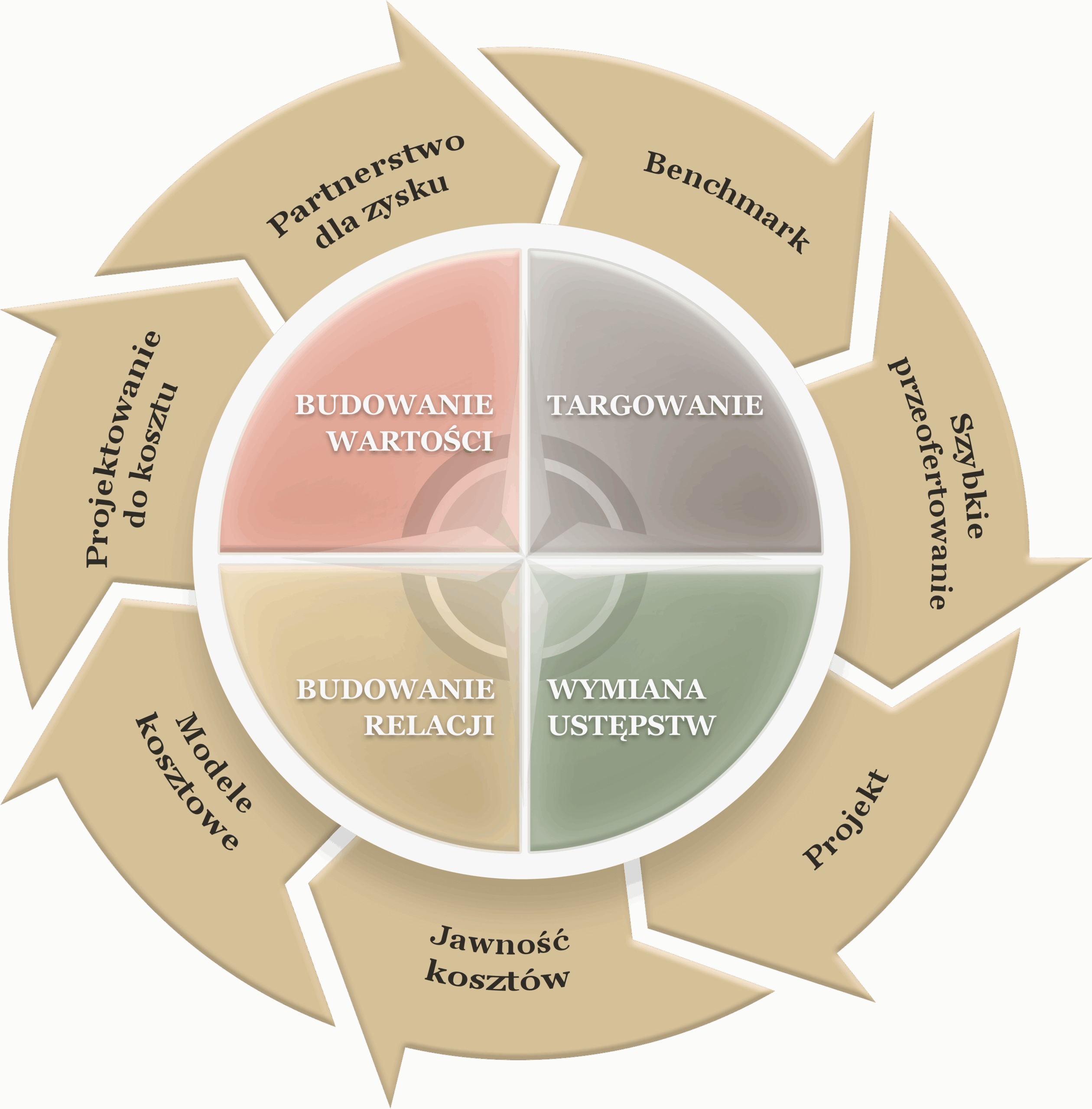 • Budowanie relacji – długofalowa współpraca – negocjacje zespołowe i zarządzanie informacją